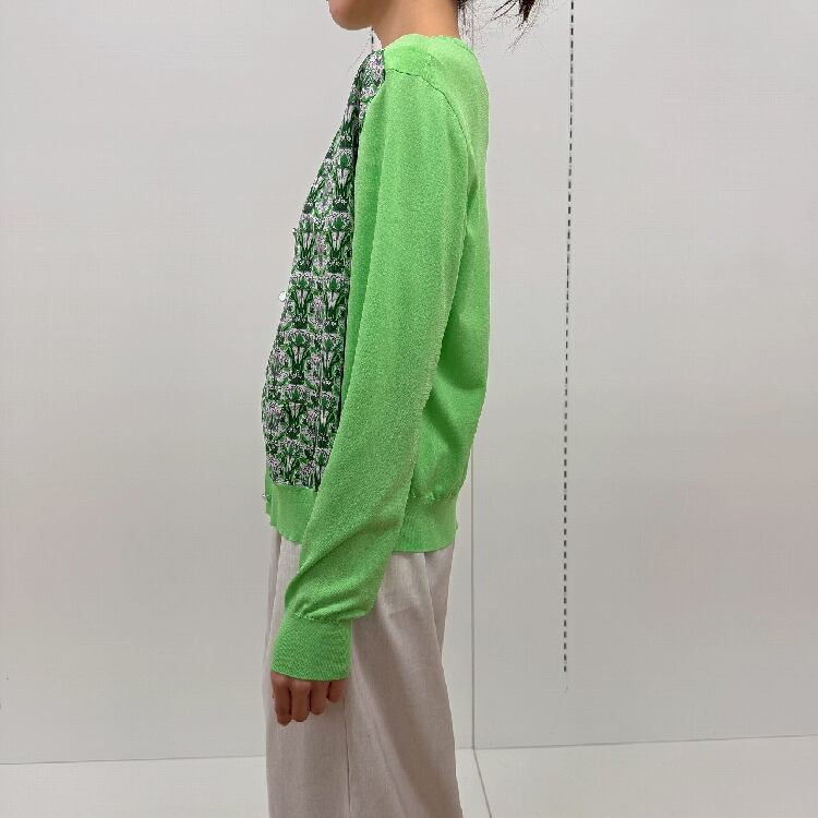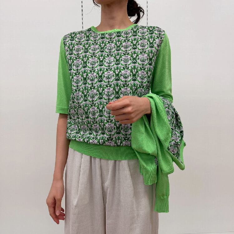 プリントの綿素材とニットのくみ合わせ